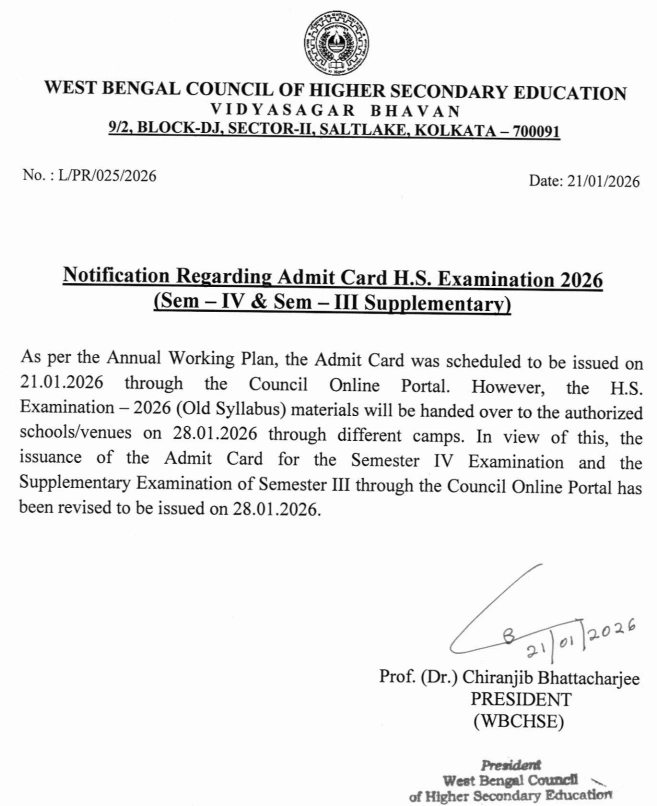 The materials for the West Bengal Higher Secondary Examination - 2026 (Old Syllabus) will be handed over to the authorized schools/examination centers through various camps on 28.01.2026.