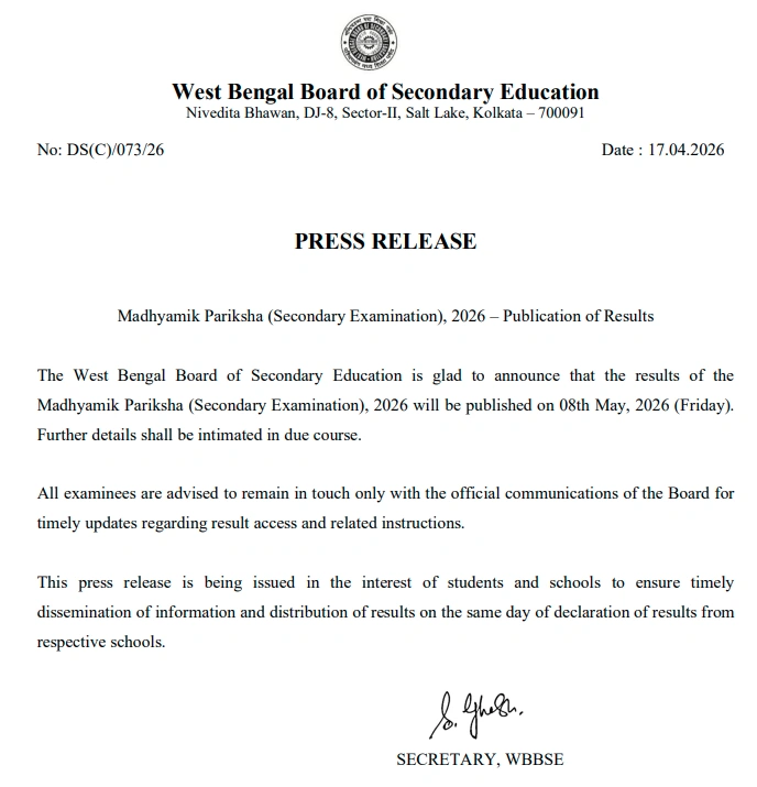 According to a press release issued by the Secretary on April 17, the results of the Madhyamik Examination will be declared on May 8, 2026 (Friday).